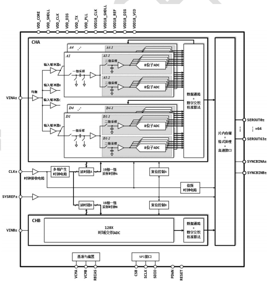 系统结构,基于先进的 CMOS 工艺设计实现。整体 ADC 的模拟输入带宽大于 25GHz,通过先进的数字
